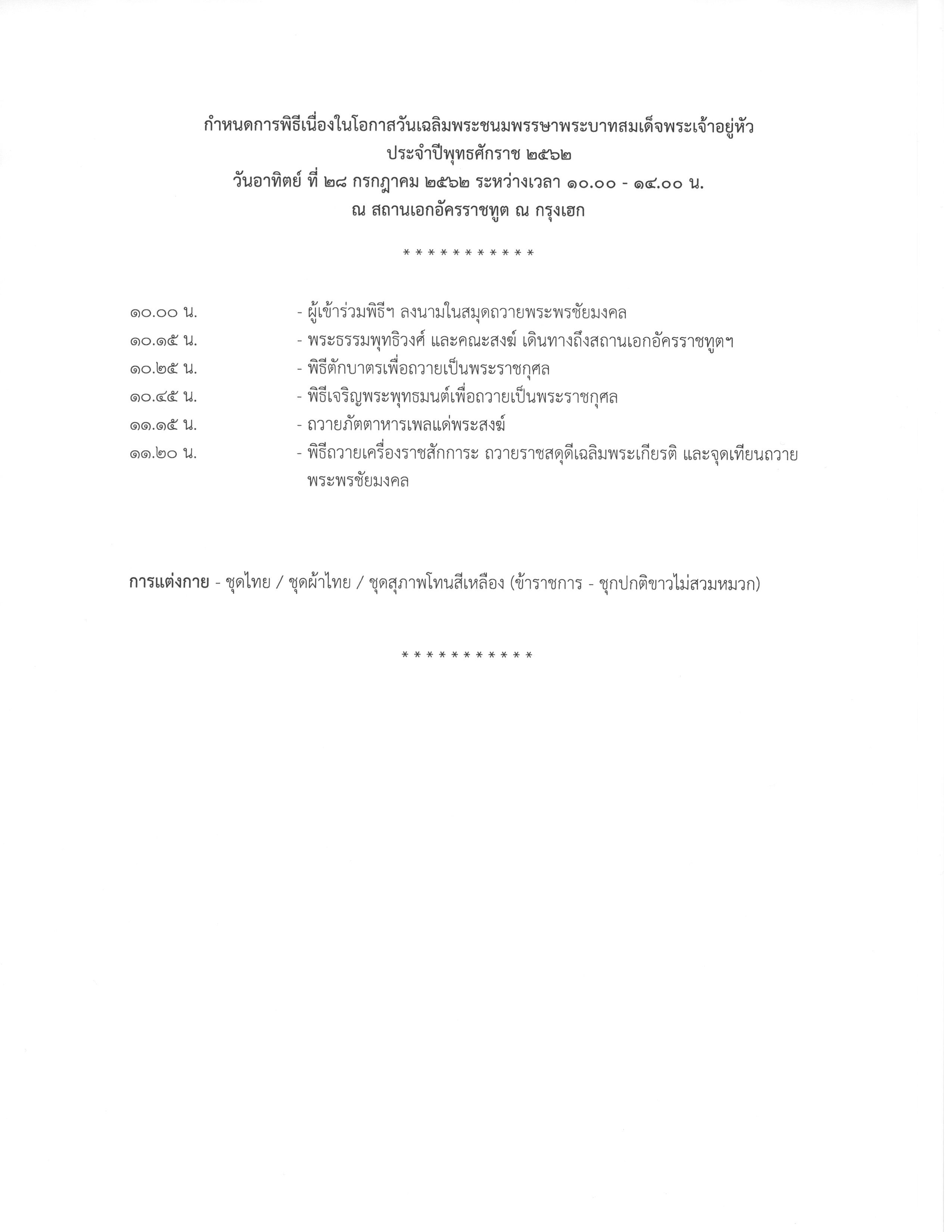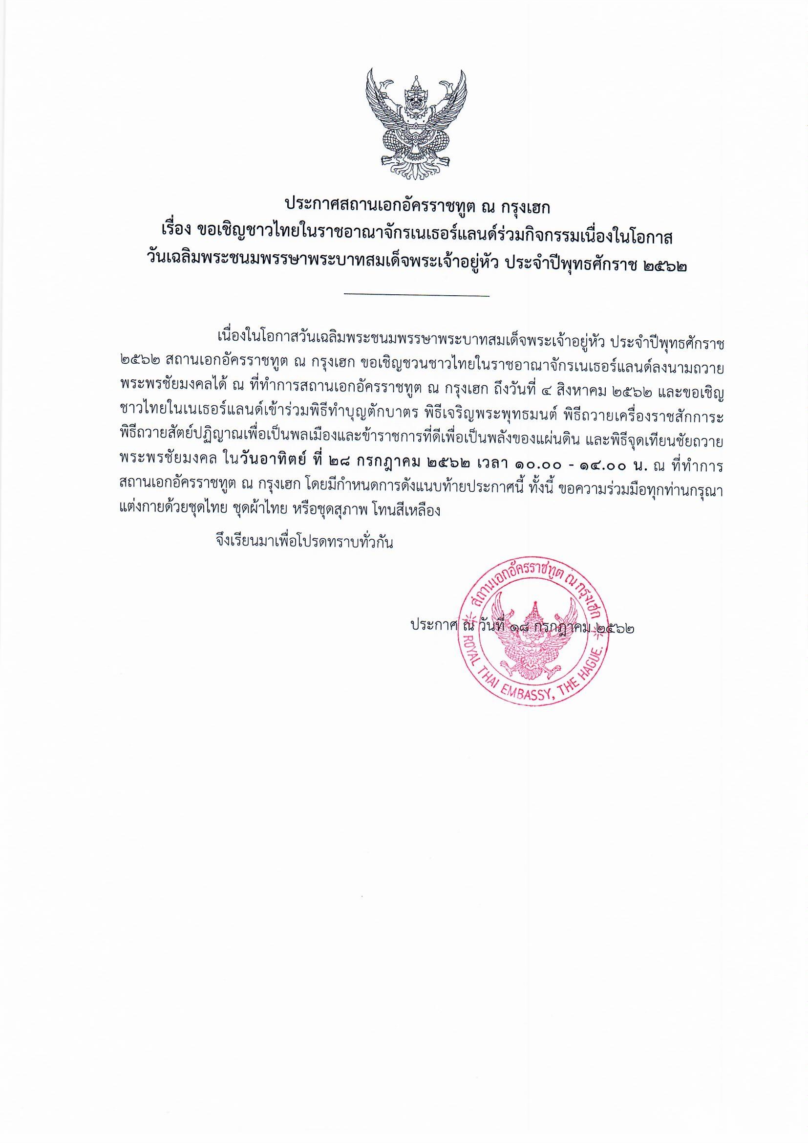 ขอเชิญชวนชาวไทยในราชอาณาจักรเนเธอร์แลนด์ร่วมกิจกรรมเนื่องในโอกาสวันเฉลิมพระชนมพรรษาพระบาทสมเด็จพระเจ้าอยู่หัว ประจำปี พ.ศ. ๒๕๖๒